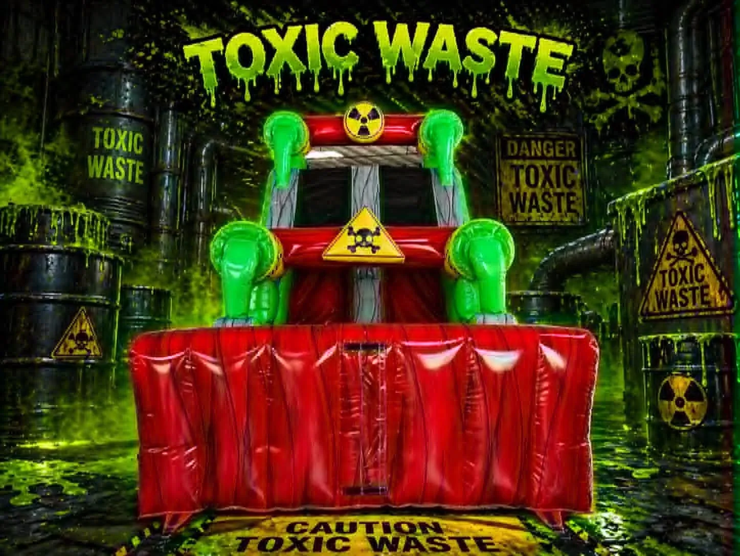 Featuring a striking “toxic waste” theme with bright green accents, caution graphics, and an eye-catching design, this water slide is perfect for older kids, teens, and even adults looking for an adrenaline-pumping experience. Riders climb to the top and race down the steep slide into a refreshing splash landing, making it a must-have for hot summer days.