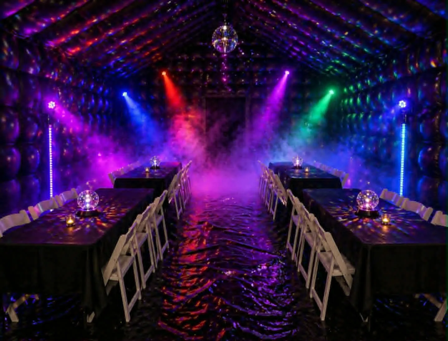 This unique inflatable nightclub rental creates a private party atmosphere right in your backyard or event space. Featuring sleek black flooring, club-style lighting, and a high-energy vibe, this setup is perfect for birthdays, teen parties, adult celebrations, graduations, and special events that need that extra wow factor.