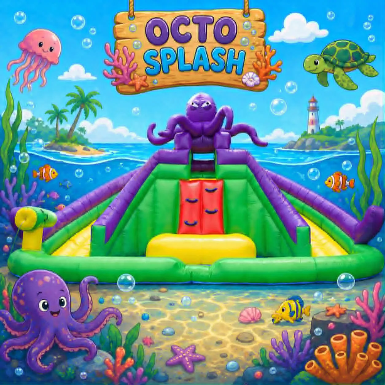 Featuring a playful octopus design, bright underwater graphics, and a refreshing splash zone, this inflatable is perfect for keeping kids entertained and cool all day. The center climbing area leads to a fun slide that drops into a splash pool, while built-in sprayers keep the water flowing for continuous excitement.